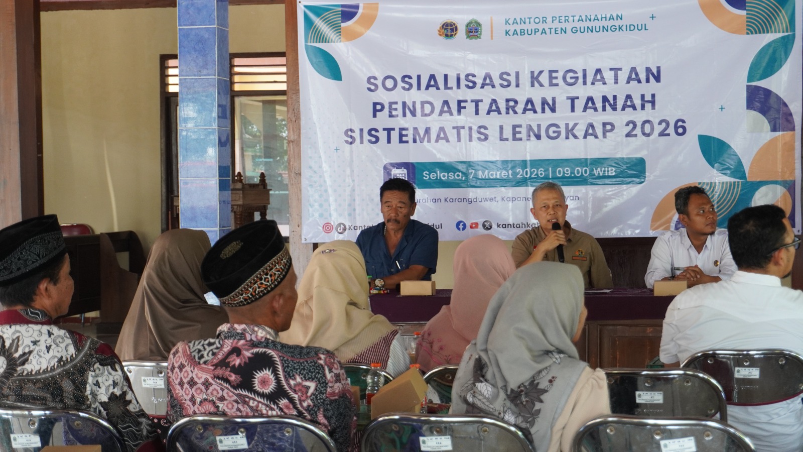 Presisi5. com || Gunungkidul — Kegiatan Penyuluhan Pendaftaran Tanah Sistematis Lengkap (PTSL) Tahun 2026 yang diselenggarakan oleh Kantor Pertanahan Kabupaten Gunungkidul dilaksanakan pada hari Selasa, 7 April 2026, bertempat di Balai Padukuhan Karangduwet, Kapanewon Paliyan, Kabupaten Gunungkidul. Kegiatan ini bertujuan untuk memberikan pemahaman kepada masyarakat terkait pentingnya pendaftaran tanah guna memperoleh kepastian hukum atas hak kepemilikan tanah. (10/04/26)